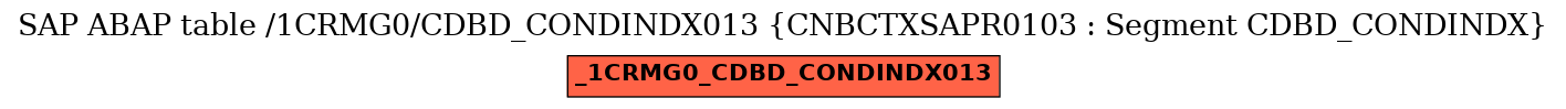 title {label: "SAP ABAP table /1CRMG0/CDBD_CONDINDX013 {CNBCTXSAPR0103 : Segment CDBD_CONDINDX}", size: "20"} # Entities [_1CRMG0_CDBD_CONDINDX013] {bgcolor: "tomato"} # Relationships
